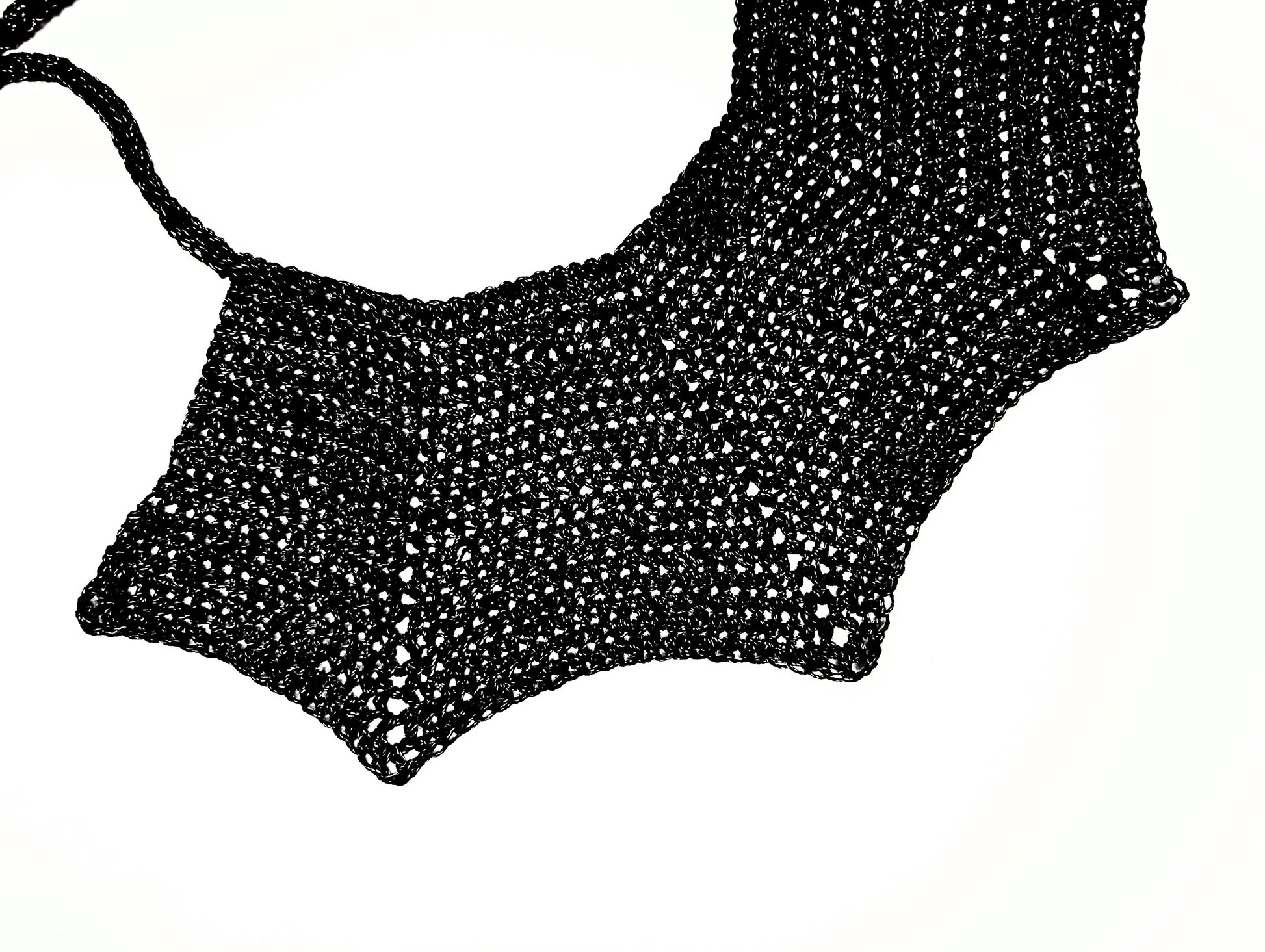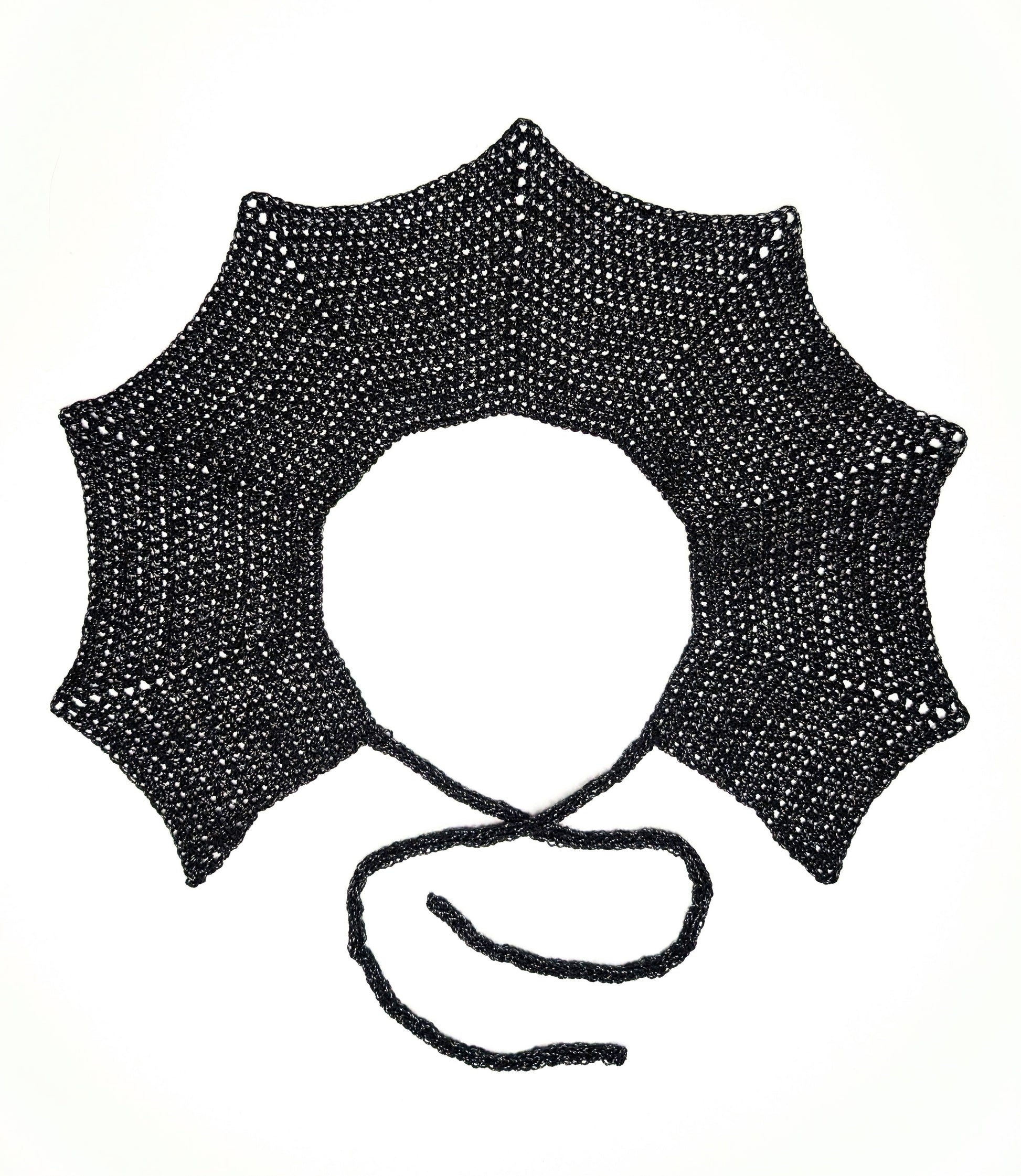 A crochet collar with a batwing silhouette and tie front, perfect for vamping up your look for Halloween.