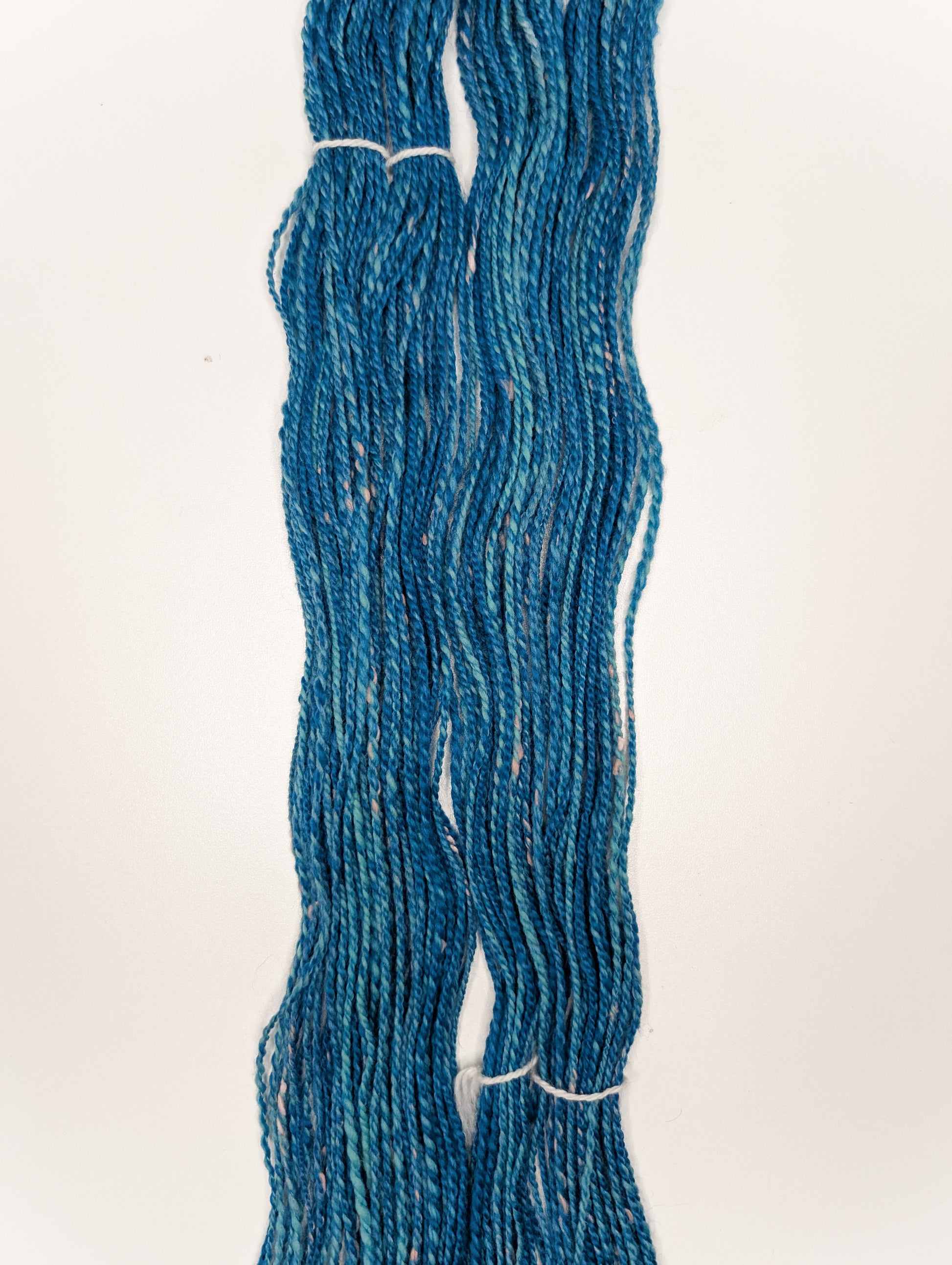 A DK weight handspun yarn in teal and blue wool with small inclusions of pink recycled cotton yarn. Two ply.