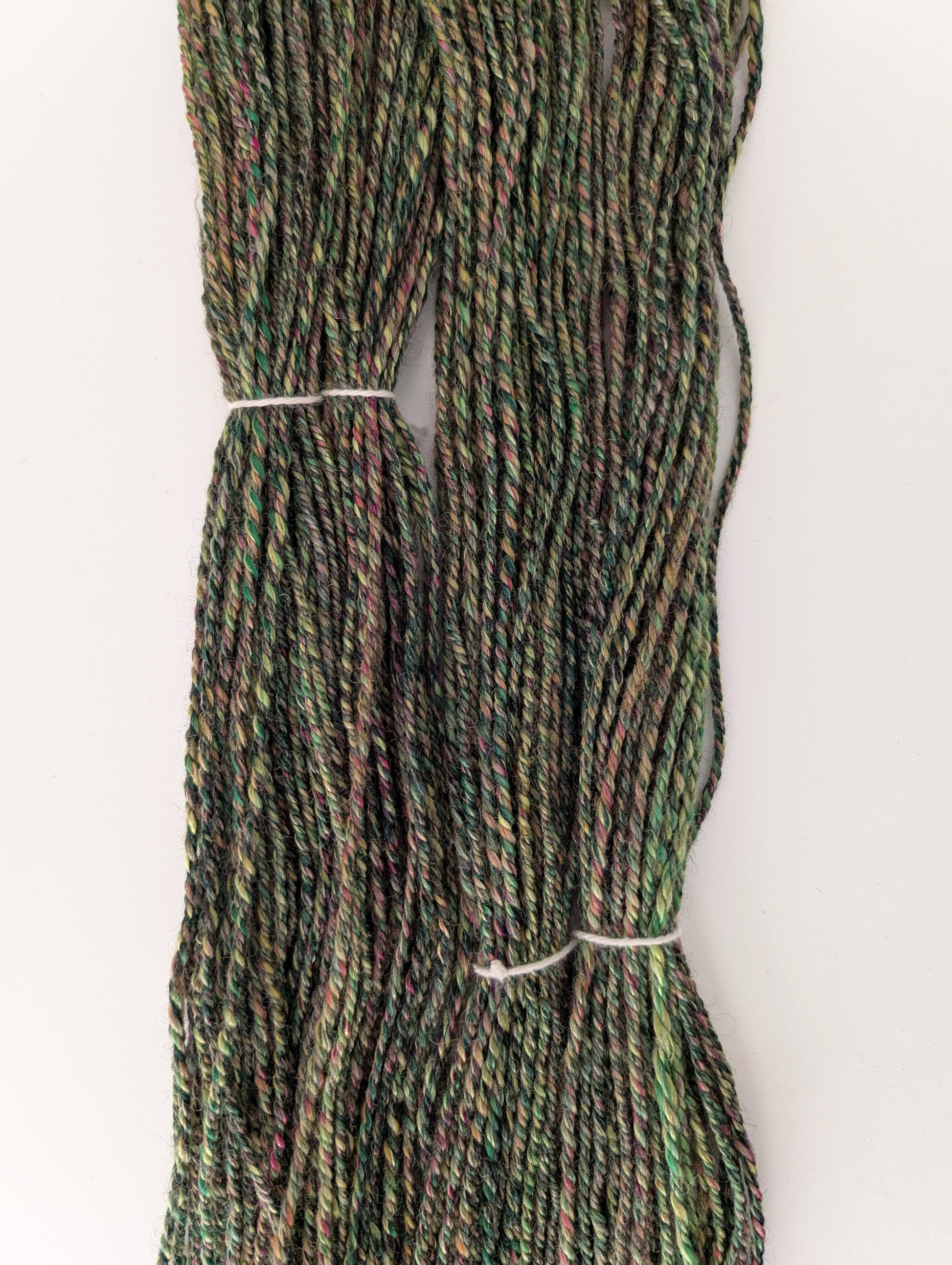 A worsted weight yarn with a beautiful silky sheen and variegated colours of greens, yellow, and pink. Two ply.