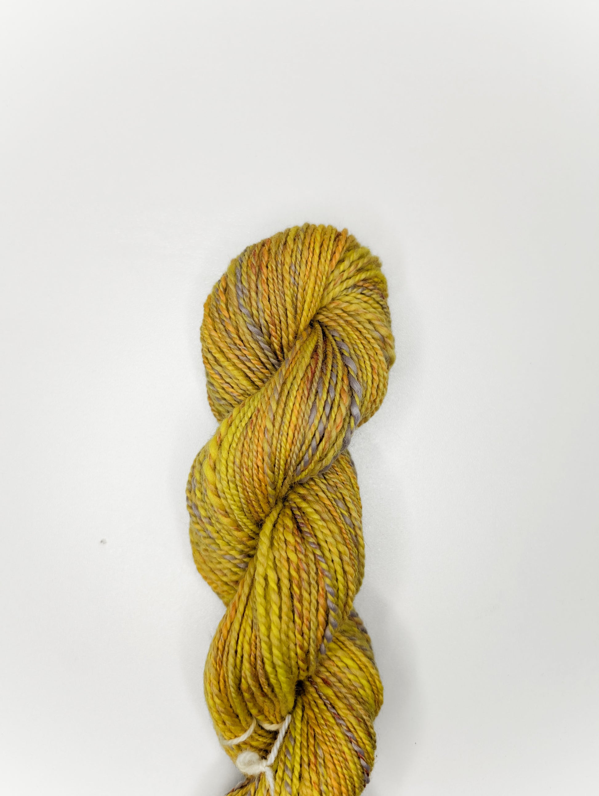 A DK weight yarn with bright yellow wool and orange, pink and pale purple acrylic. Two ply.